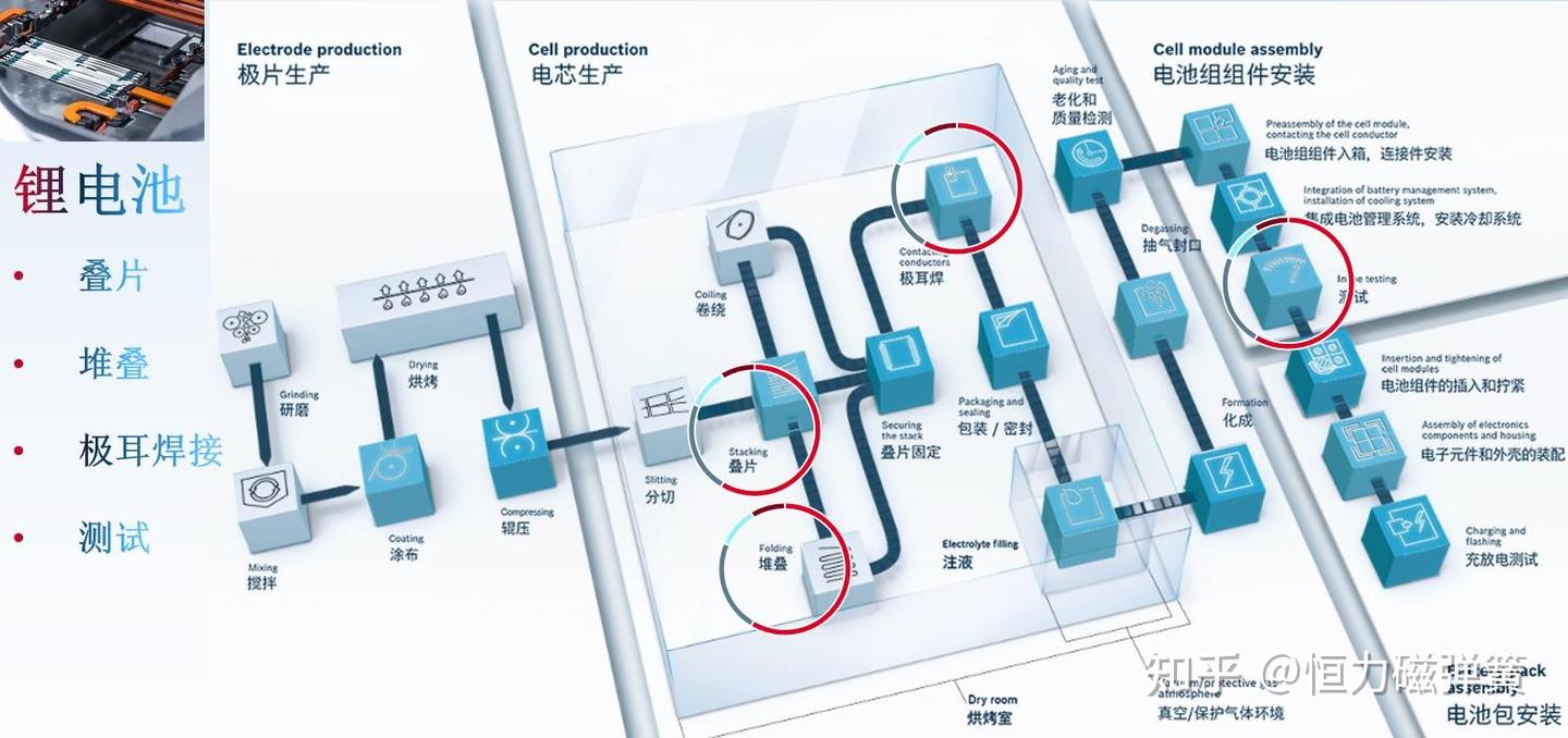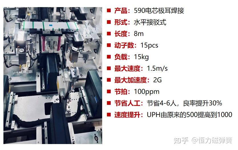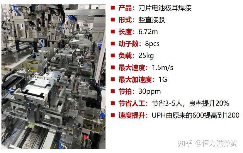 生产过程工艺包括:极耳自动上料、极抦预焊接、极耳进行切齐,极耳与锂电池极抦焊接,极耳自动包胶,极组绝缘测试,工序完成电池自动下料等;其中多种工艺需要自动化磁悬浮输送系统完成。